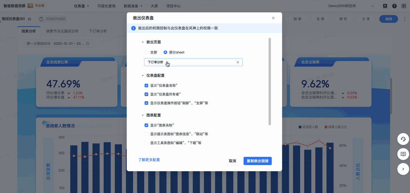 - 仪表盘嵌出配置精细化: 一方面支持了更多配置项,另一方面也支持用户嵌出部分sheet页,方便用户根据业务所需,选择适合的嵌出内容,也能让嵌出效果更美观。