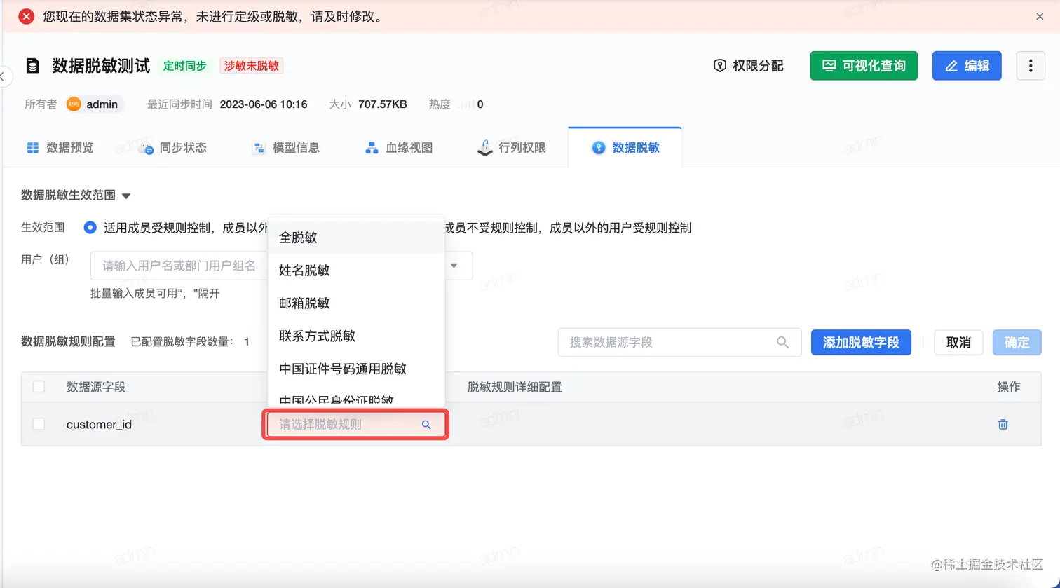 - 脱敏 生效范围自由可控:用户可根据业务具体需要,针对性设置数据脱敏的生效范围,对于敏感用户范围进行配置,更有业务适配性。