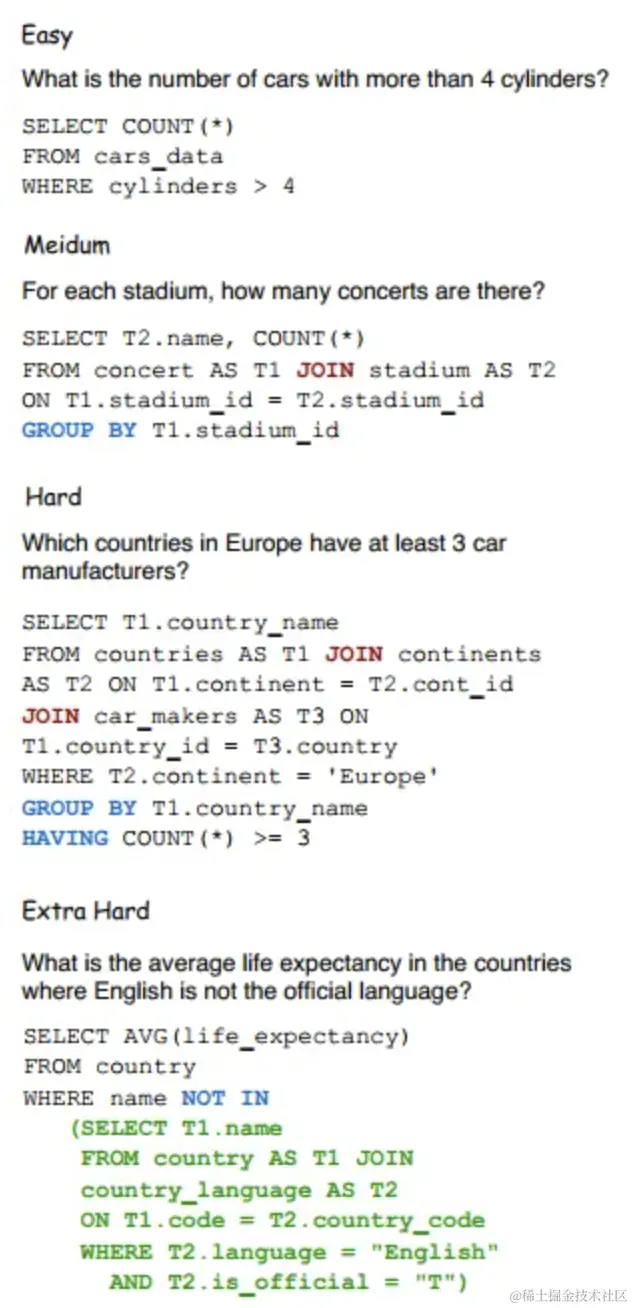 Spider数据集是多数据库、多表、单轮查询的T2S数据集,也是业界公认难度最大的大规模跨领域评测榜单,由2018年耶鲁大学提出,由11名耶鲁大学学生标注。