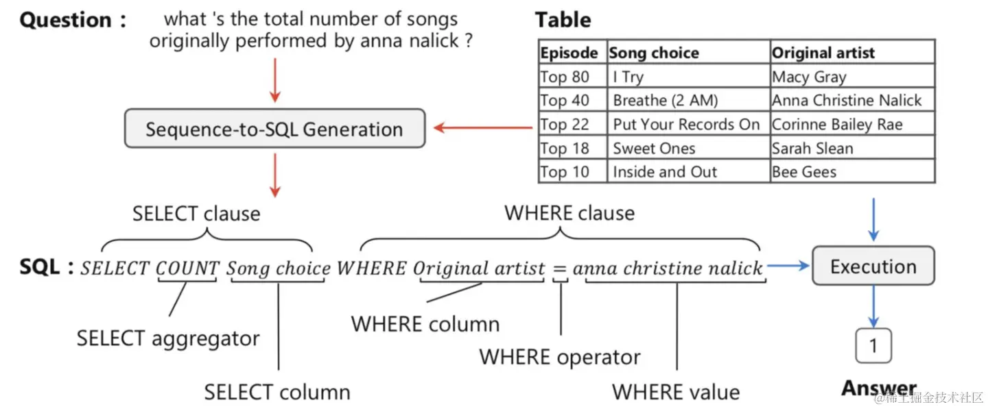 举个例子比较直观,T2S任务给定一个表格Table,输入就是一段自然语言文本,输出就是SQL语句,如图1(Sun, Tang et al., 2018)所示:用户想要查询 “由安娜最初演唱的歌曲总数是多少?”,经过T2S任务解析后,输出SQL语句,执行模块再在数据库中执行SQL,返回执行结果:1。