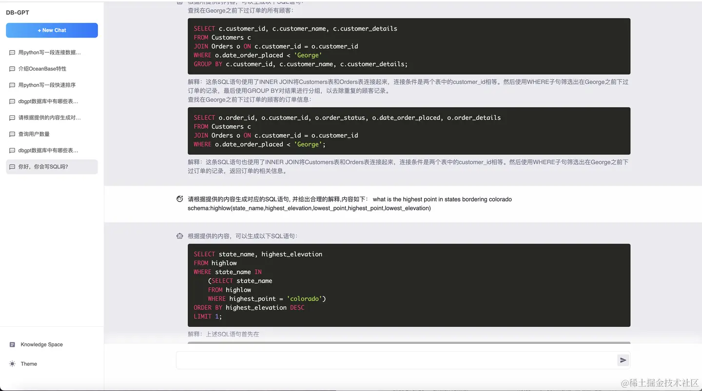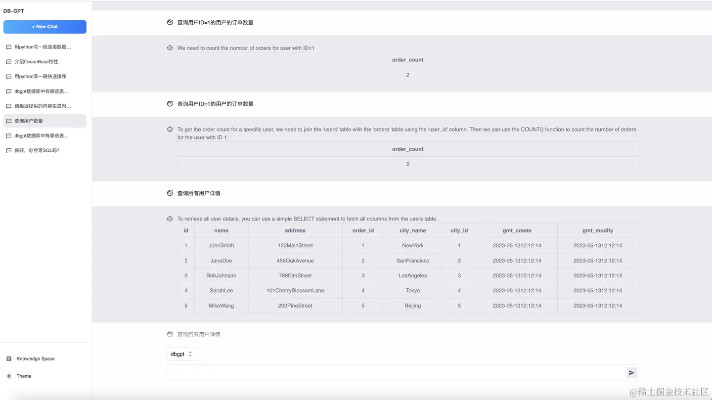前不久,github上有个比较有意思的项目叫DB-GPT,专注于做数据库场景下的安全可靠隐私的大模型,目前已经有5.7k的star,可以直接体验一下T2S的功能,这里贴上几张效果图,详情可以参考点击前面的超链接进入使用。