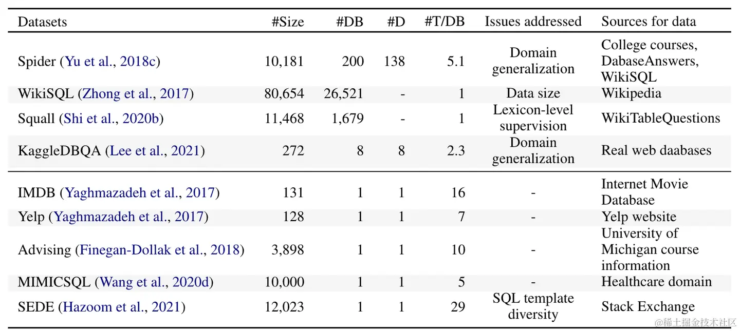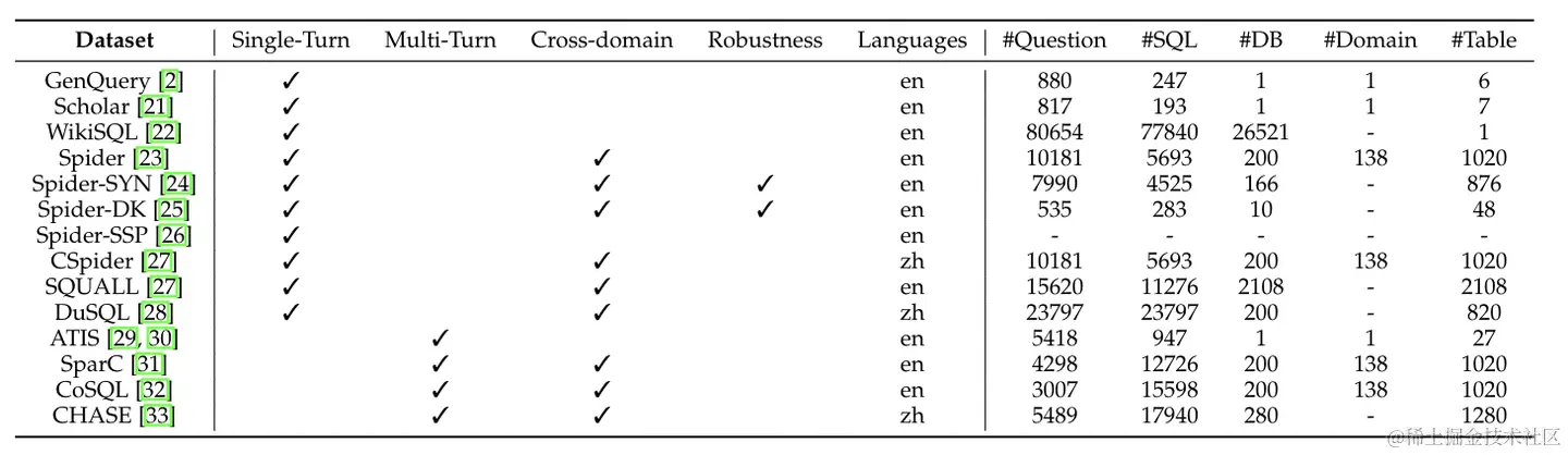 在TKDE综述文章中,常见的数据集有GenQuery、Scholar、WikiSQL、Spider、Spider-SYN、Spider-DK、Spider-SSP、CSpider、SQUALL、DuSQL、ATIS、SparC、CHASE等,如图4所示。