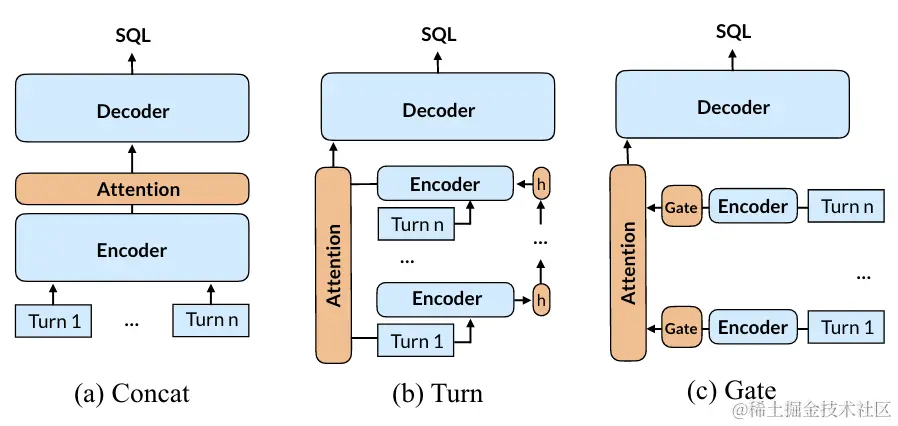 多轮输入表征Multi-turn input representation。如图10所示,研究了不同上下文信息编码方法对多回合T2S解析性能的影响,包括(a)接触每个问题序列中的所有NL问题作为输入,(b)使用回合级编码器处理每个问题,以及(c)设计一个门机制,以平衡每个历史问题的重要性。