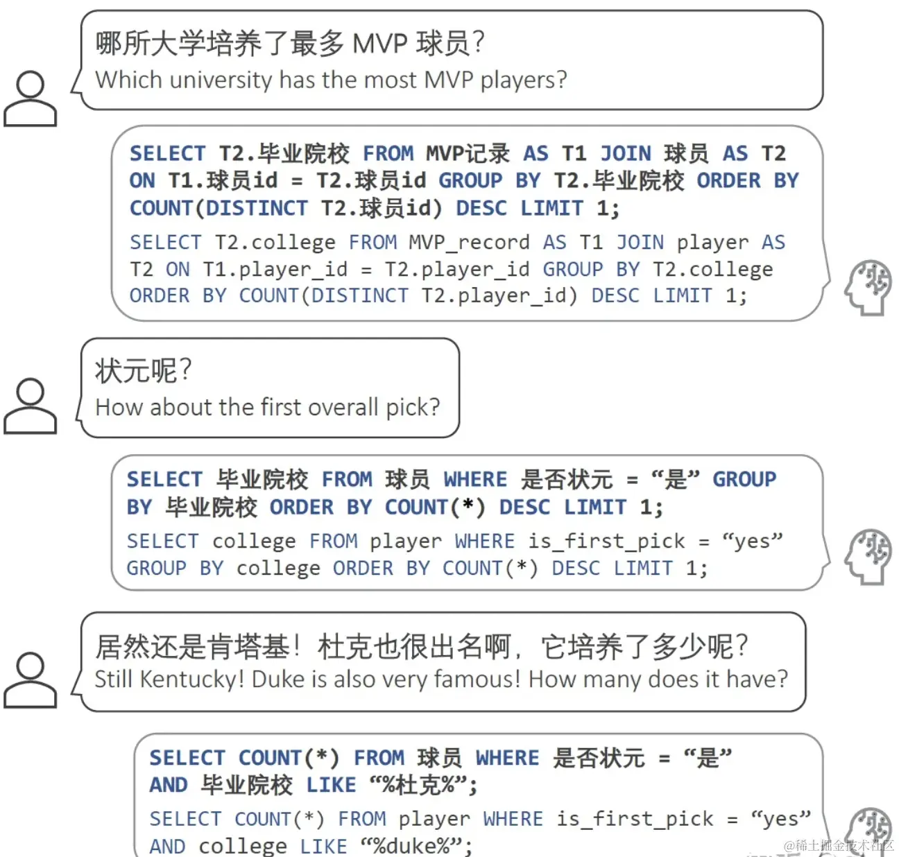 - 大规模,包含5459个多轮问题组成的列表,一共17940个<query, SQL>二元组,多轮对话如图8所示,用户的第一个输入“哪所大学培养了最多MVP球员”属于独立问题,没有可参考的上下文;紧接着第二个问题“状元呢”直接省略了主语“大学”,完整的问题应该是“哪所大学培养了最多状元”,模型需要结合历史信息才能生成正确的SQL。第三个问题同样类似。