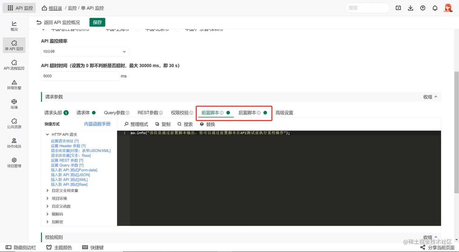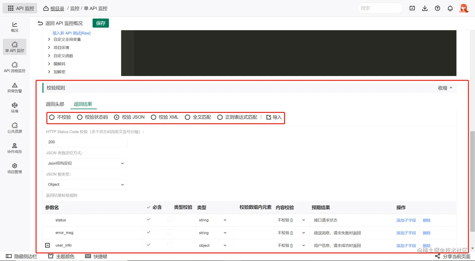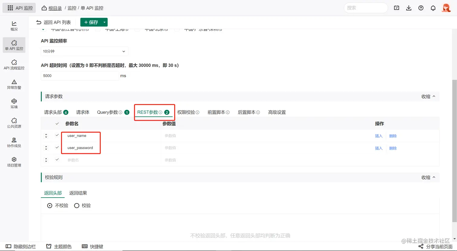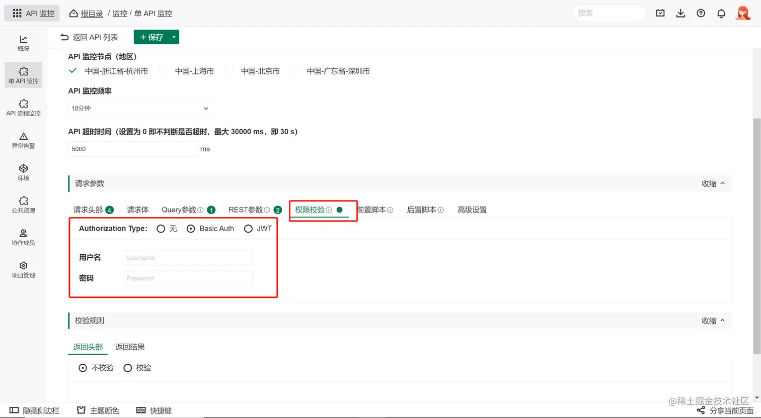 进入API监控编辑页后,你可以设置API的基本信息、请求信息、校验规则等内容。