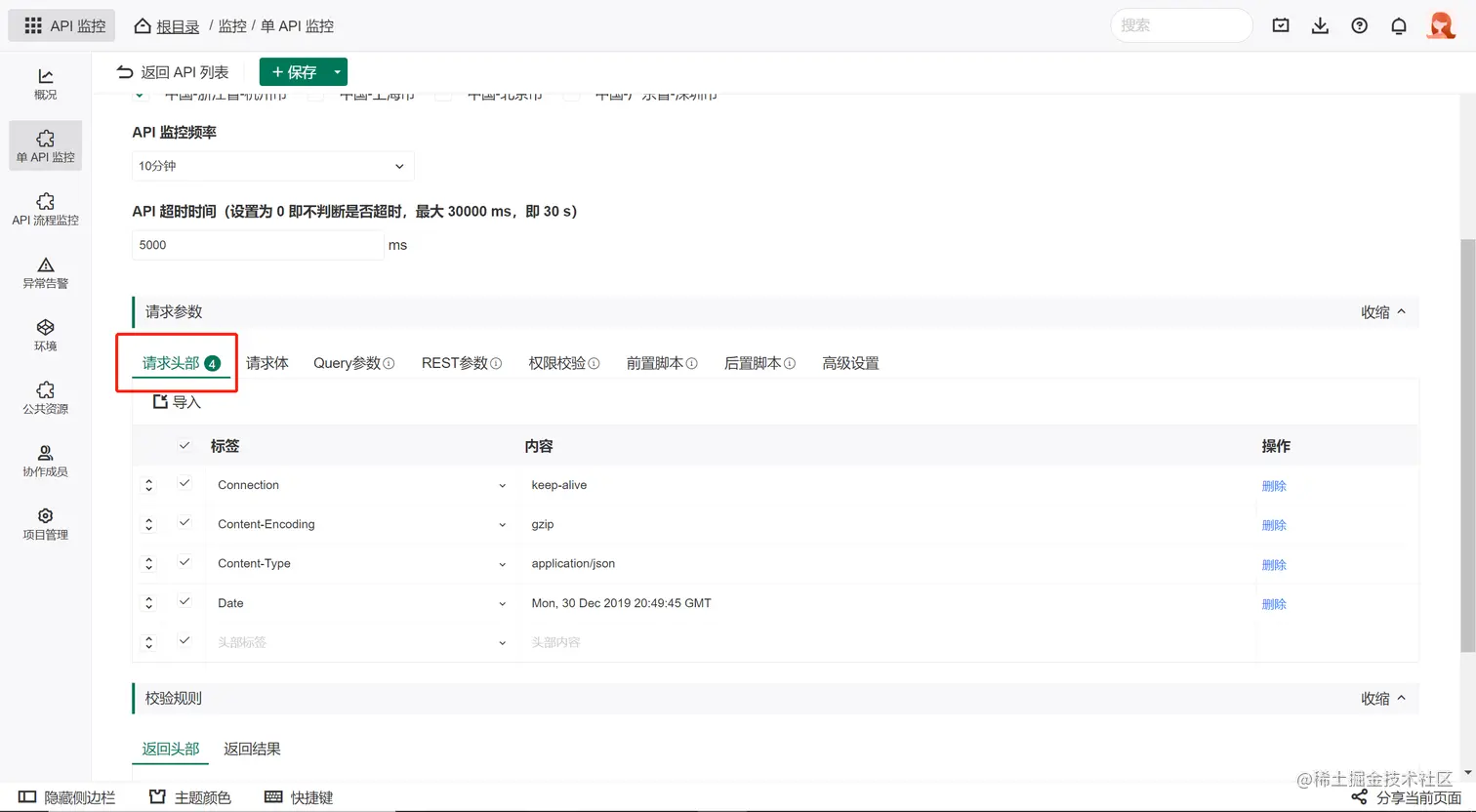 超时限制:当API的响应时间超出设定的限制时间时,系统将会自动中断该次监控请求,并且报请求超时异常。
