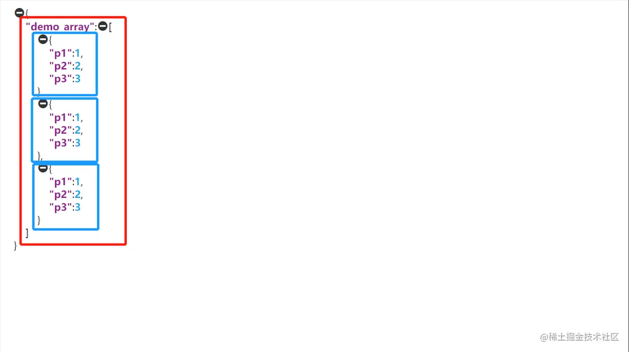 有如下JSON数组,当demo_array字段(红色部分)是一个数组类型时,开启校验数组内元素后会对demo_array下一级的字段(蓝色部分)进行整体的循环校验。