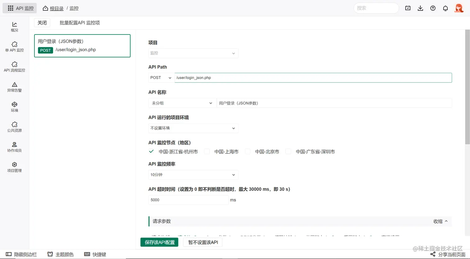 API监控节点:系统会在选中的监控节点区域发起API监控请求