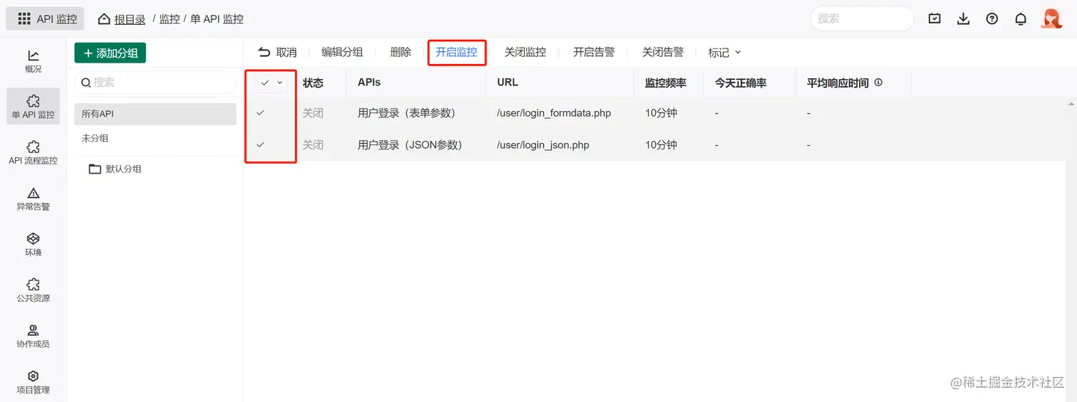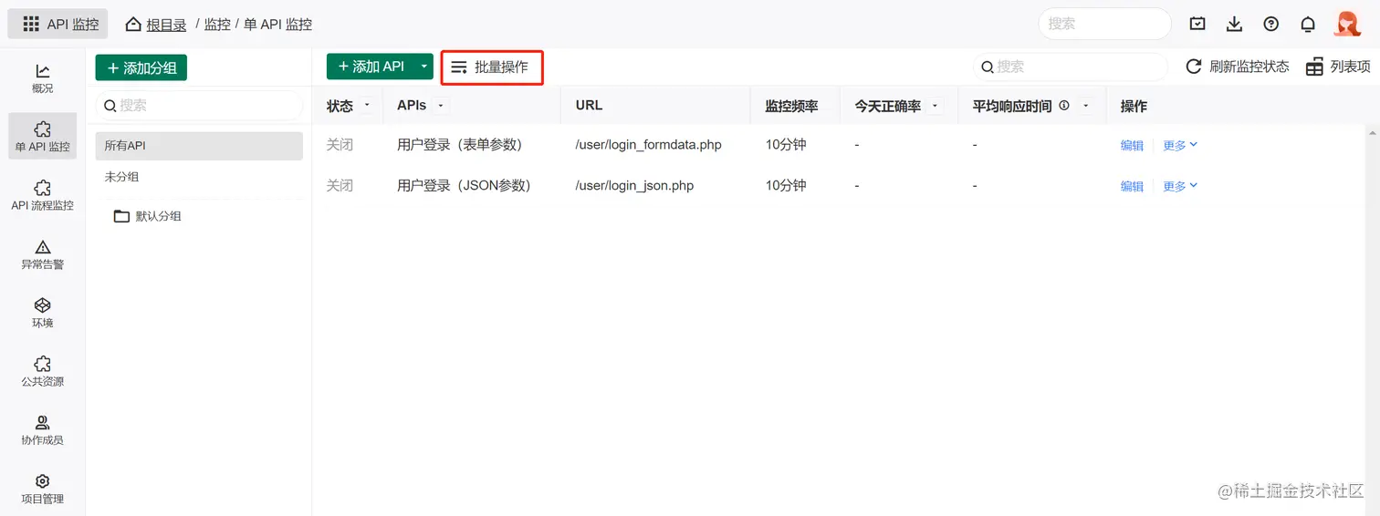 也可以在顶部点击 批量操作 按钮来对API做批量开启监控: