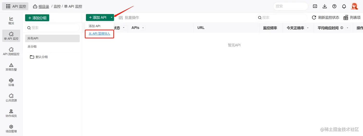 进入API监控页面,点击 添加API 按钮旁的下拉菜单按钮,在菜单中选择 从API管理导入: