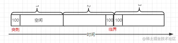 如图我们定义了窗口大小为1s,最大请求数100,窗口内超过100的请求数将被拒绝。实现上也非常简单,利用redis的incr自增计数,当前时间秒作为缓存key,每次自增后判断是否超过指定大小即可。