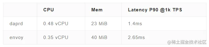 下表是汇总的 Dapr 官方标注的 daprd 资源与性能消耗数据,以及 Istio v1.16(最新版未找到)官方标注的 envoy 资源与性能消耗数据: