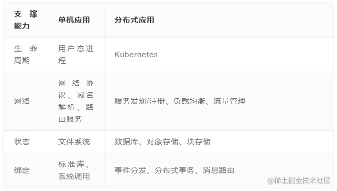单机应用一般大都是以用户态进程的形式运行在操作系统上。显然,与微服务类似,单机应用的核心关注点也是业务逻辑,与业务关系不大的支撑能力,都要依赖操作系统来完成。