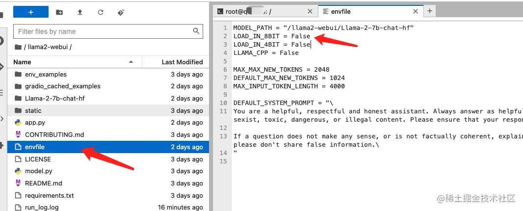 JupyterLab 左侧目录导航栏打开llama2-webui项目文件夹下的envfile文件,将里面的LOAD_IN_8BIT = True改成LOAD_IN_8BIT = False,然后按 ctrl+s 保存文件。