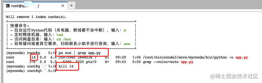 新建一个 terminal,输入ps aux | grep app.py查看相关服务进程id,并使用kill指令结束进程。