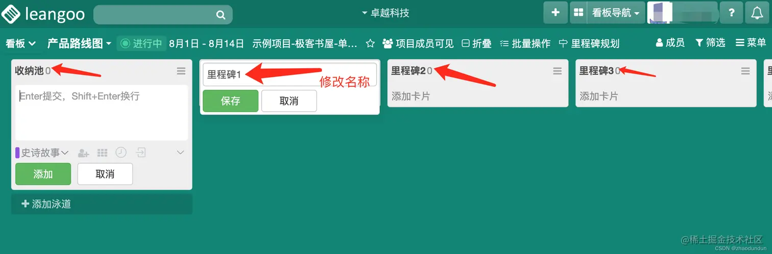 2、系统会自动创建几个列表,如:收纳池、里程碑1、里程碑2、里程碑3、4....我们可以根据需求自己增加或减少或更改列表名称