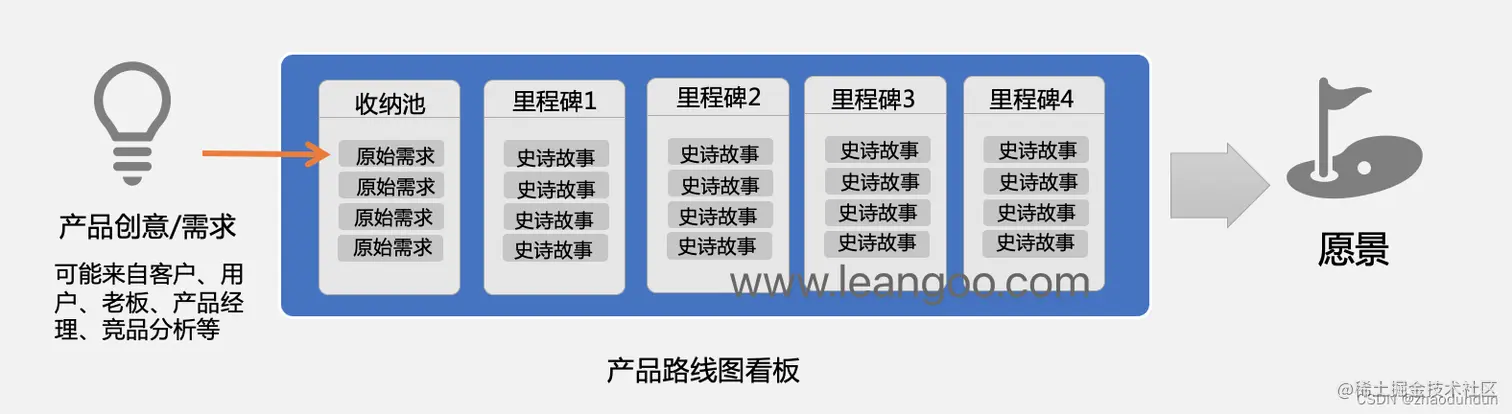 有价值的需求整理成一个个的史诗故事,规划到产品路线图的各个里程碑。
