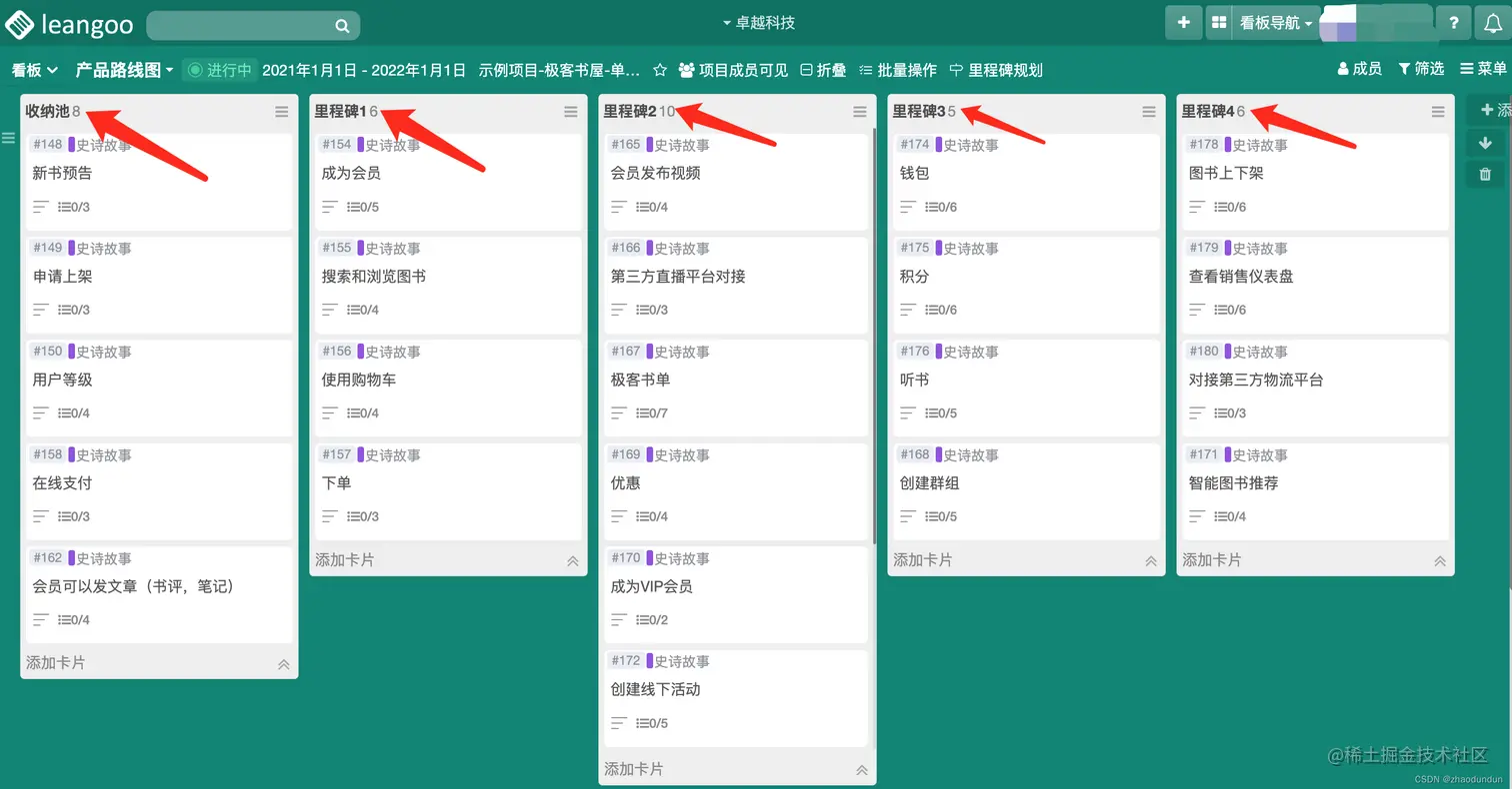 我们使用目标驱动的方式来制定路线图。首先确定路线图上各个里程碑的目标,然后围绕目标确定需要哪些史诗故事。