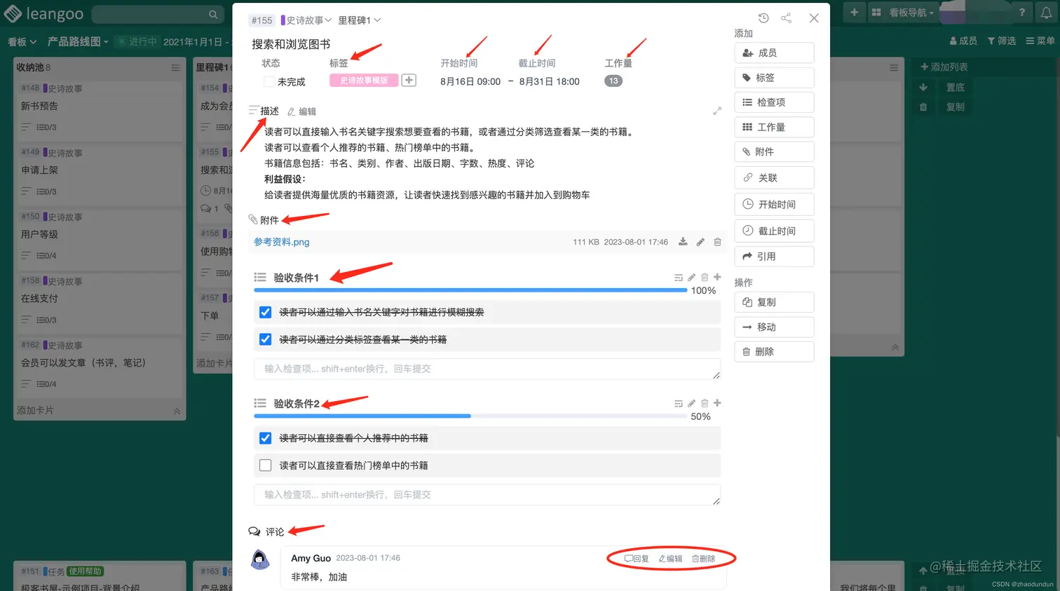 4、看板上的每一张卡片都可以打开,打开后可以填写更多信息,如:评论,检查项,附件,任务开始截止时间等...