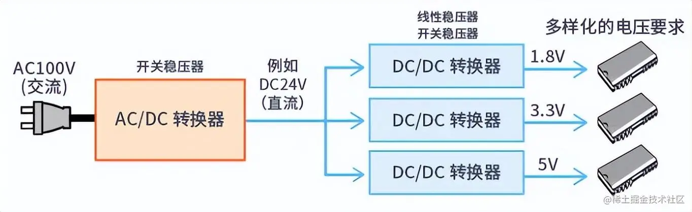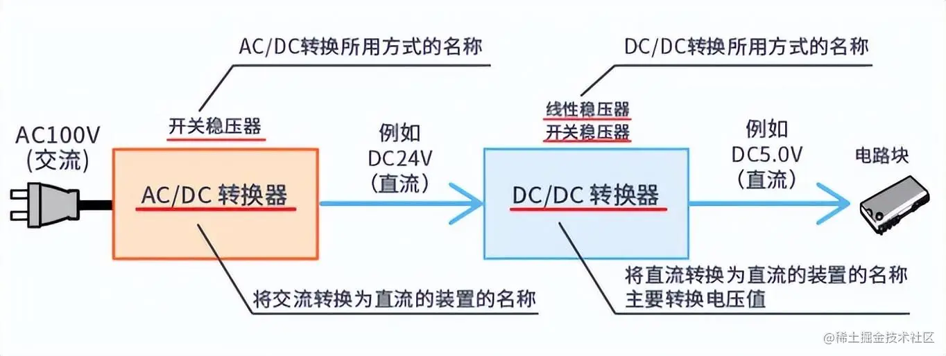 插入插座进行工作的电气产品需要使用将AC(交流)100V转换为DC(直流)的"AC/DC转换器"。这是因为大部分半导体部件只能在DC下工作。整机电路板上搭载的IC等具有各自固有的工作电压范围,电压精度要求也不同。通过电压不稳的电源等供电会导致误动作或特性劣化等异常。因此,需使用"DC/DC转换器"转换为所需的电压并实现稳定化。