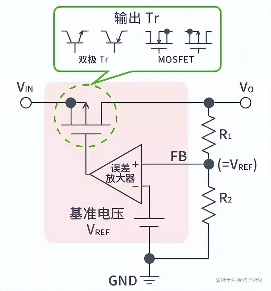 下图的输出晶体管为MOSFET,不过也有使用双极晶体管的产品。