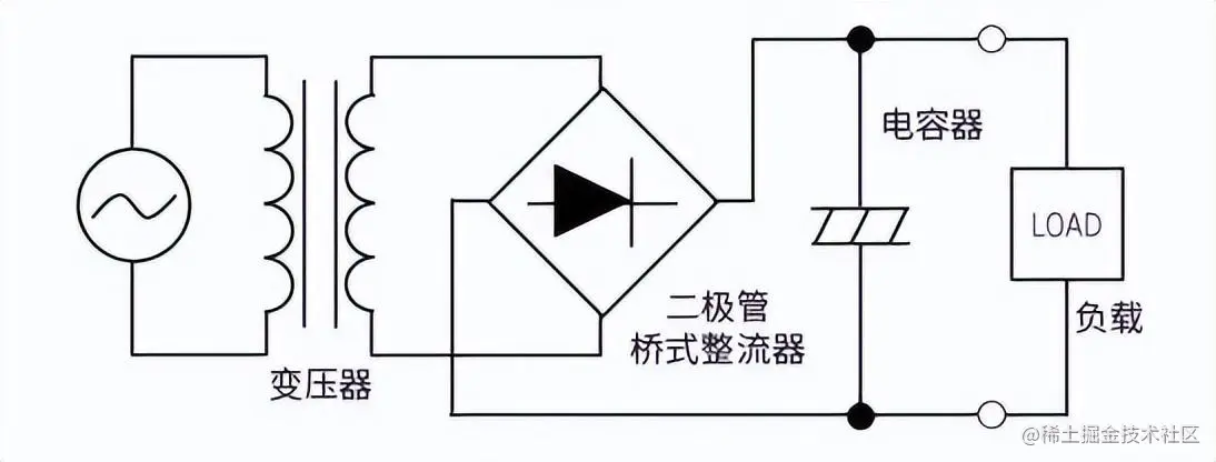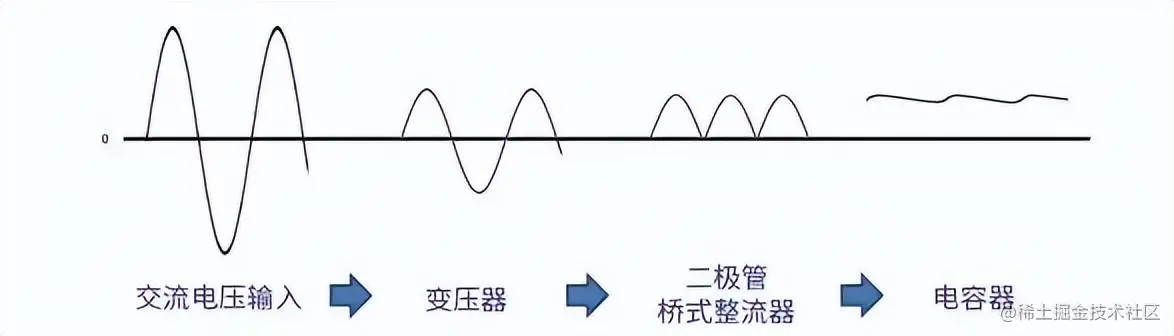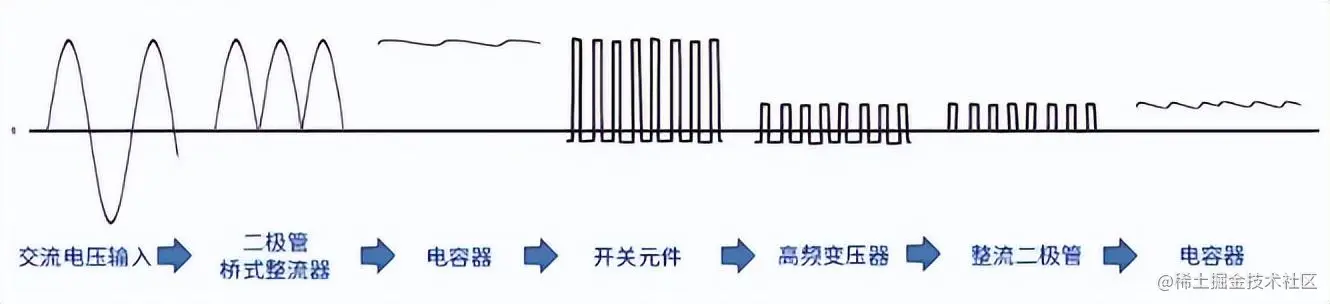 接下来,通过二极管桥式整流器对经过变压器降压的交流电压进行全波整流,转换为脉冲电压。最后,经电容器平滑并输出纹波小的直流电压,这是最传统的AC/DC转换方法。