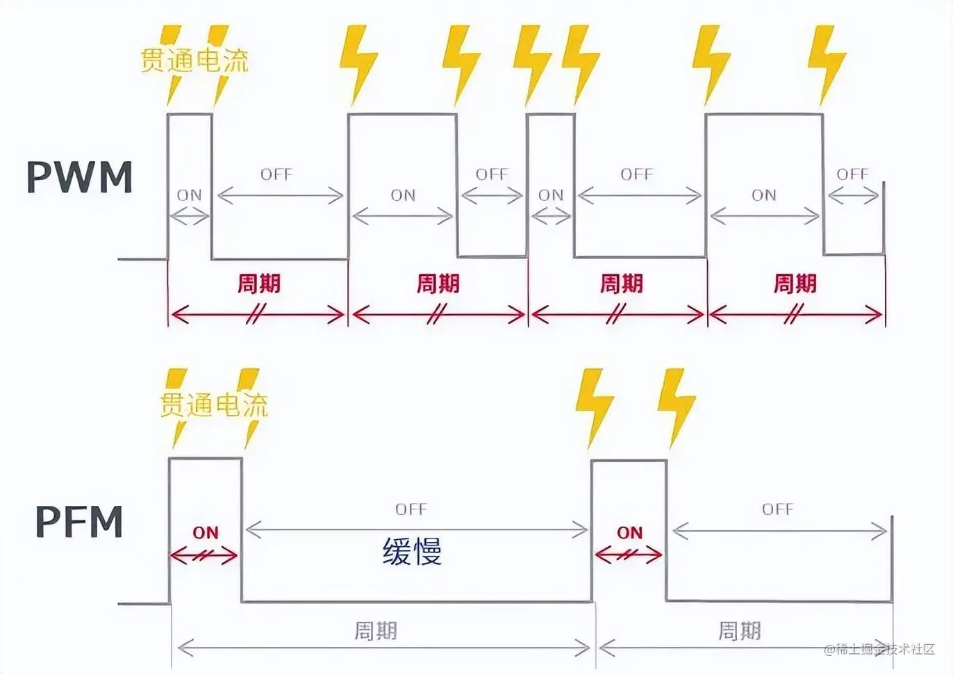 PFM方式根据输出电流量改变频率,效率较高,但开关时会不定期发生噪音。这种频率无法确定的噪音很难消除,要解决噪音,采用频率恒定的PWM方式更容易操作。