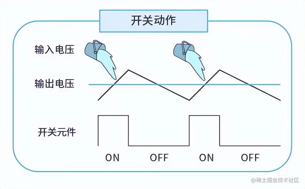 实际输出电压值低于目标电压值时,则会对开关元件进行控制,使ON时间变长。这样,输出电压值就会上升。反之,高于目标电压值时,则控制ON时间变短。