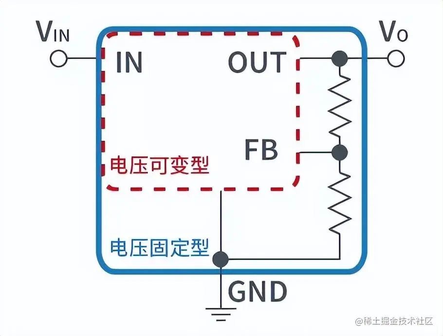 其次,还可分为电压固定型和电压可变型两种。固定型由输入、输出、GND三个引脚构成,内置有输出电压设定用电阻。