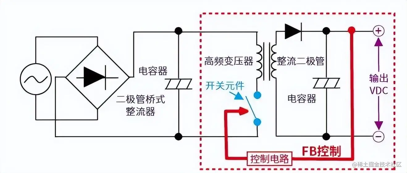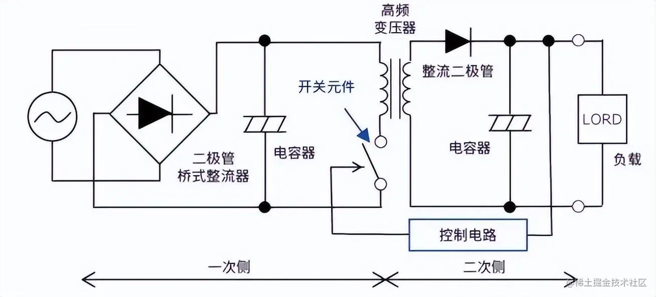 与家用频率(50/60Hz)相比,开关元件使用的频率更高(例如,100kHz)。由于高频工作,所以可以实现变压器的小型化、轻便化。