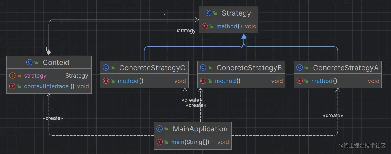- 策略模式,使用的时候,客户端会实例化一个Context上下文对象,然后将需要使用的具体策略类实例对象作为参数传给上下文对象,客户端通过调用Context上下文对象的某个方法,得到所需结果;