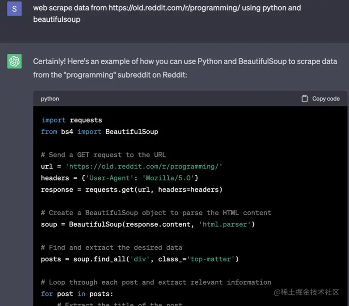我们还可以输入具体的要求,让ChatGPT为我们直接编写一段代码。此时,准确并详细的描述需求对于获得期望的结果至关重要。