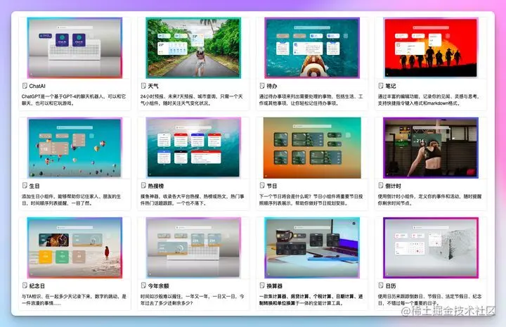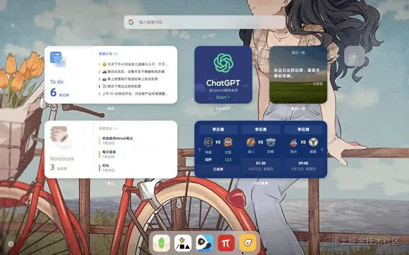 目前,Wetab 已经提供了包括 AI 工具、日历、待办、天气、时钟、节日、倒计时、纪念日、电影日历、时钟、换算器、每日一言、游戏、习惯养成、历史上的今天、汇率、股票、NBA 赛事、游戏、书签等在内的 30 种小组件。