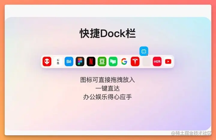 操作简单。选中图标,直接拖拽至页面底部。 Dock 栏支持自动隐藏和弹出。