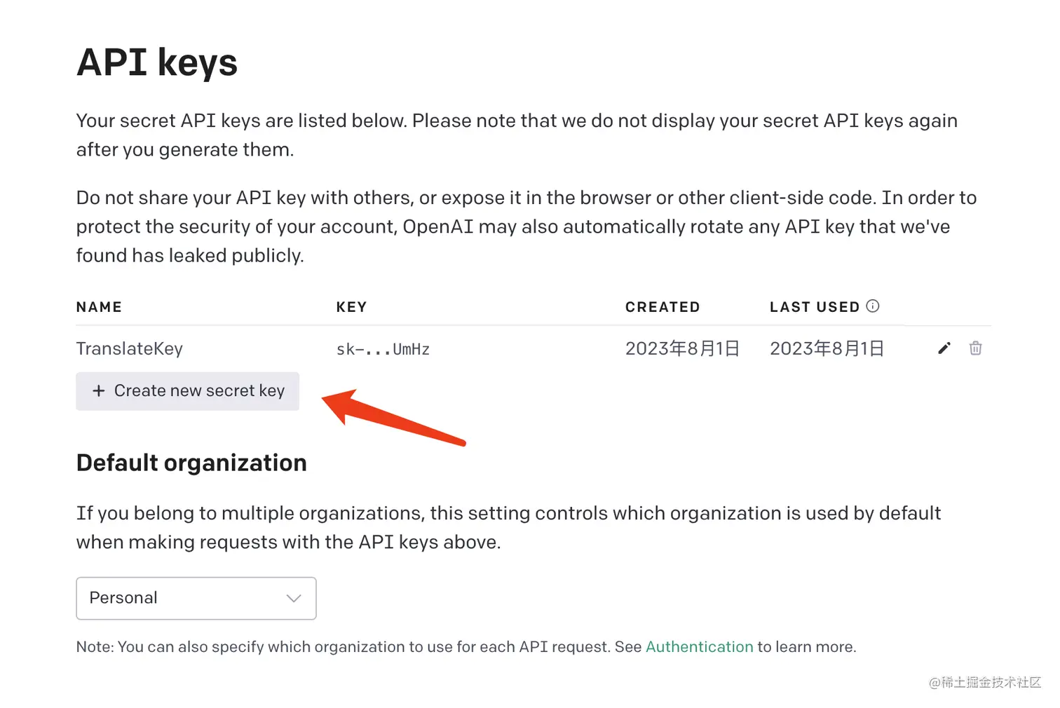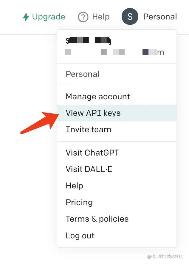 进入页面后,点一下页面右上角的「Personal」,在弹出的窗口中选「View API keys」,咱们需要去创建一个。