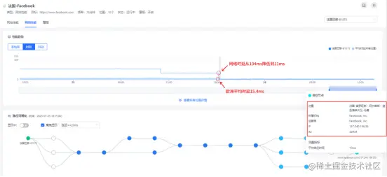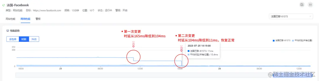 第二次变更:2023年7月25日18时15分,巴黎访问的Facebook服务器IP变更为157.240.196.35,位于法国普罗旺斯-阿尔卑斯-蓝色海岸大区-马赛,网络时延从104ms降低到11ms,低于欧洲平均时延,恢复正常。如图所示: