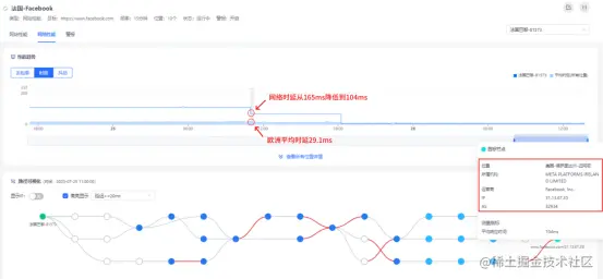 变更前:2023年7月25日11时之前,巴黎访问的Facebook服务器IP为157.240.211.35,位于中国香港,网络时延达到165ms,远高于欧洲地区的平均时延。如图所示: