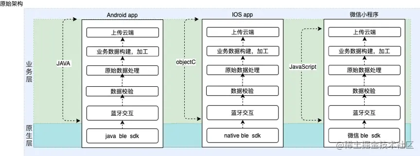 经过大量调研,和多种类型蓝牙设备接入代码实战应用发现, 三种平台在接入蓝牙设备读取到的数据之后,后面的数据处理,算法逻辑是相同,只是在 Native BLE SDK部分差异较大。从这个角度来讲,蓝牙同步功能可以抽象为:①手机与蓝牙设备交互部分;②获取蓝牙数据后续处理。