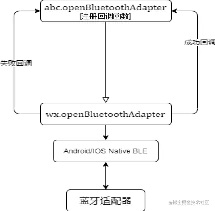 微信小程序运行环境JavaScript。只需封装微信提供同Android/IOS相同的JS BLE API即可。仅列举其中初始化蓝牙流程,如图3: