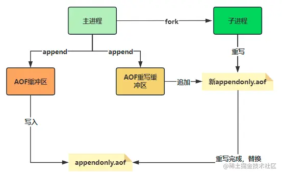 重写流程:主进程fork出一个子进程进行AOF文件的重写,子进程重写完毕后,主进程把子进程重写期间,其他客户端产生的写请求,追加到AOF文件中,替换旧文件。