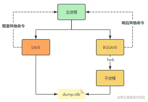 SAVE:主线程操作,同步执行,会阻塞其它命令的执行。执行[save]命令时,RDB快照生成如果时间过长,后续请求会被阻塞,客户端新发送所有命令都会被拒绝。因此在生产环境中要谨慎使用该命令,避免影响服务的正常运行。