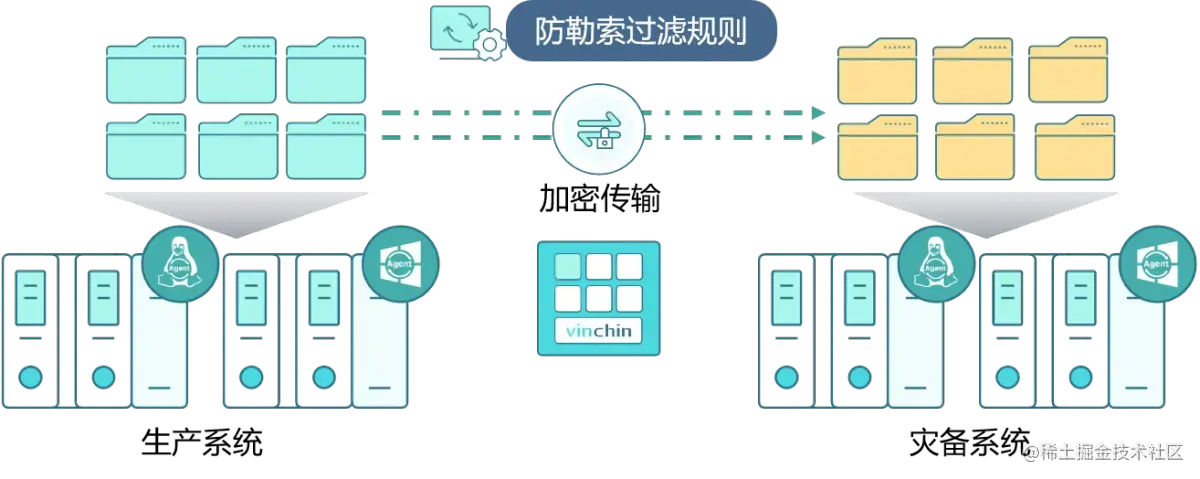 云祺容灾备份系统在面对勒索病毒的攻击时,能实时监控系统I/O情况,拦截非法进程对存储数据的恶意修改和删除,同时进行全面的数据保护实时备份,应急接管,在秒级时间内恢复业务运行,在面向业务系统、面向海量文件两种场景内,有效应对勒索软件攻击: