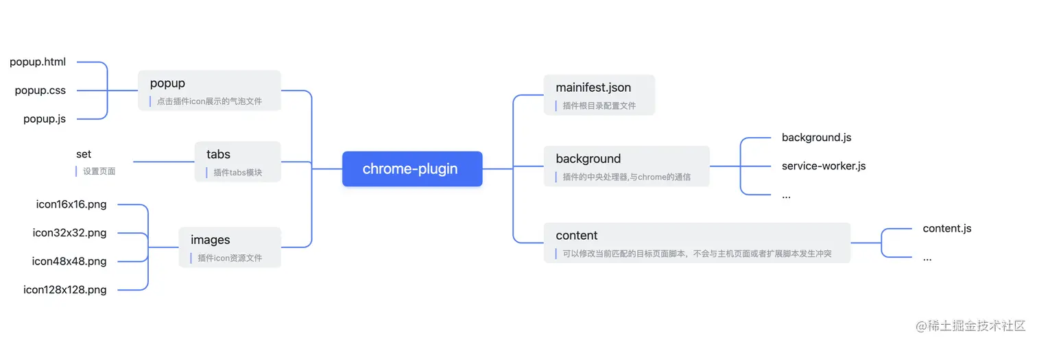 在使用webpack5搭建插件,可以参考笔者在之前写的webpack5系列笔记中有部分搭建案例,chrome插件本质上是运行在chrome浏览器的网页,因此本质上也是用网页来展现的,只是一个插件的必须满足根目录必须mainifest.json,我们具体以下面一张图来重新回顾下插件的基本要素
