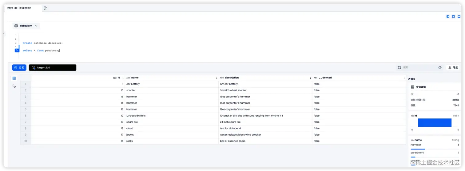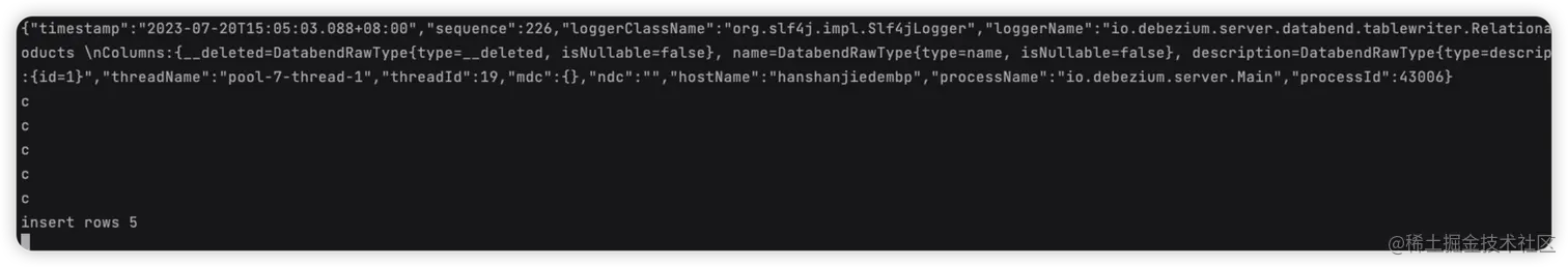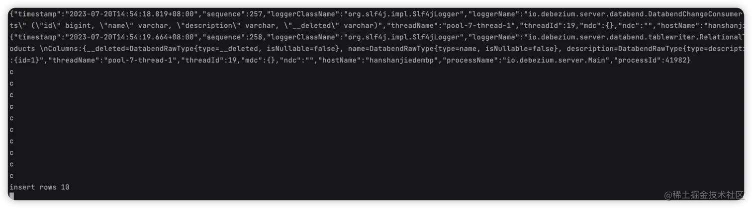 配置文件中 debezium.sink.databend.upsert=true ,所以我们也可以处理 Update/Delete 的事件。