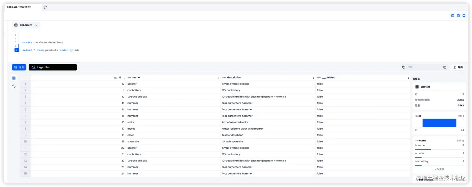 在 Databend 中可以观察到 id=12 的值的 __deleted 字段已经被置为 true。