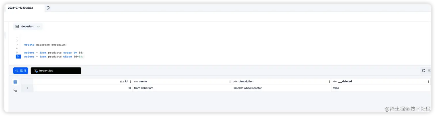 这两条事件会同时发出,在 Debezium Server Databend 中我们选择对 Delete 数据实行软删除,这就要求我们在 target table 中拥有 __deleted 字段,当 Delete 事件过来的时候我们将该字段置为 TRUE 后插入到目标表。