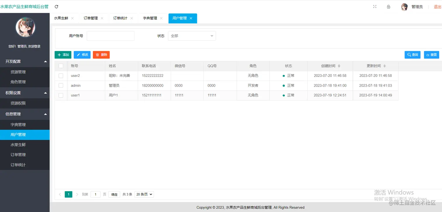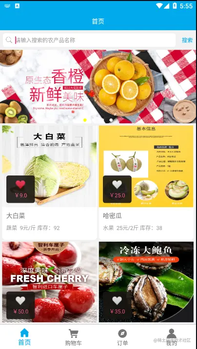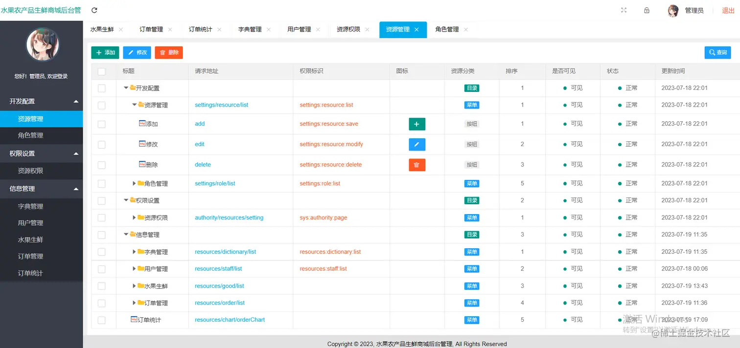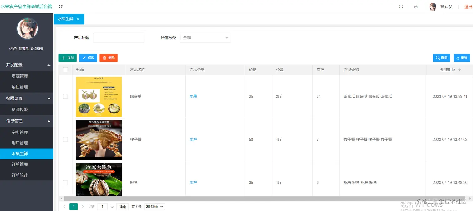 本系统包含后台管理和前端app双端系统,后台管理的功能包含: 登录, 退出, 修改管理员信息(基本信息与头像),资源管理,角色管理,资源权限分配,字典管理,用户管理,水果生鲜,订单管理,订单统计; app端功能:登录,退出, 商品列表,搜索商品,轮播图,商品详情,点赞商品,加入购物车,购物车列表,购物车商品数量增加,购物车商品数量减少,删除购物车商品,提交订单,订单支付,订单列表,立即付款,发货,确认收货,评论,用户基本信息管理,用户头像修改,密码修改,我的收藏,用户退出