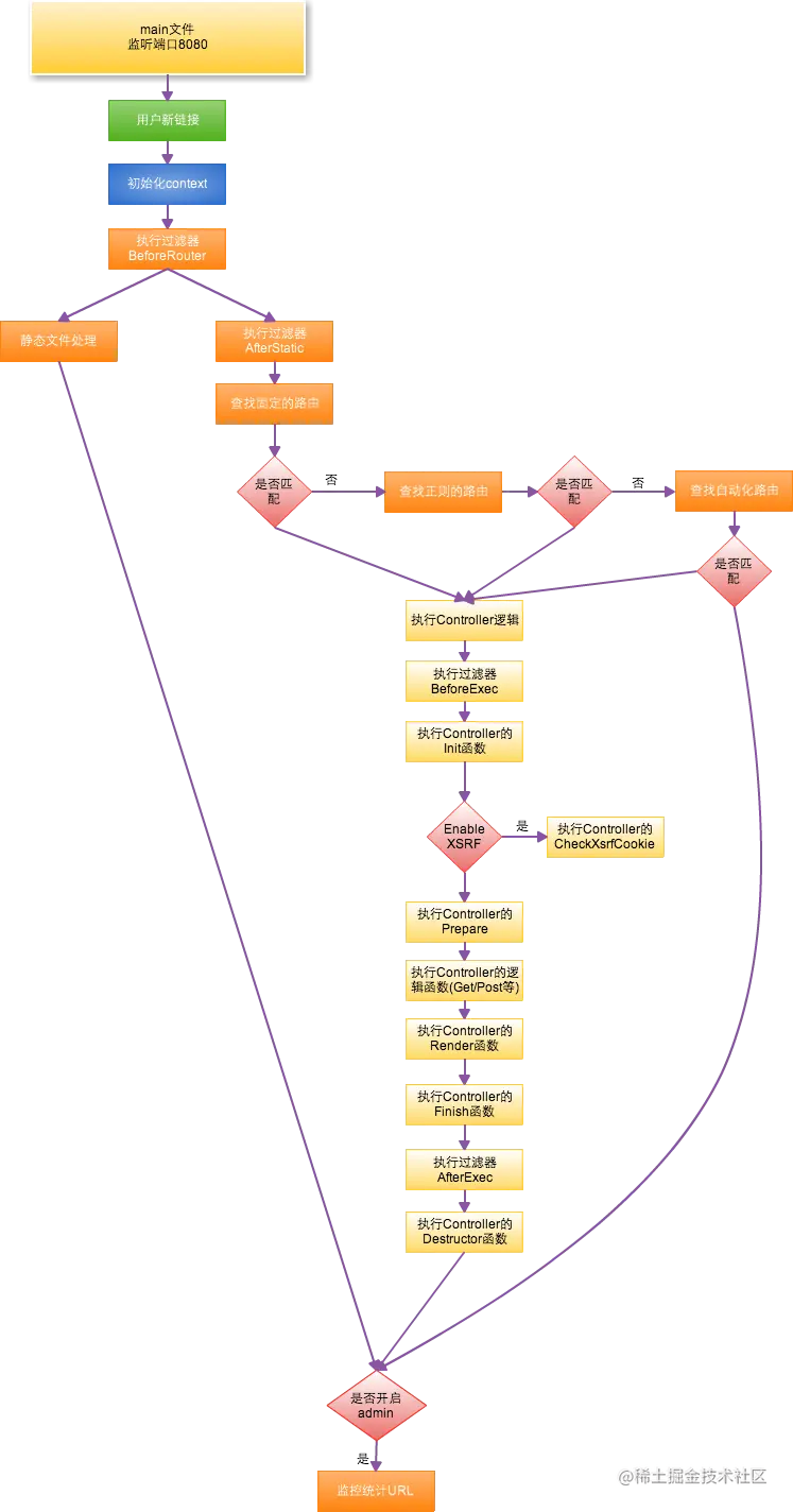 beego 是一个典型的 MVC 框架,它的整个执行逻辑如下图所示: