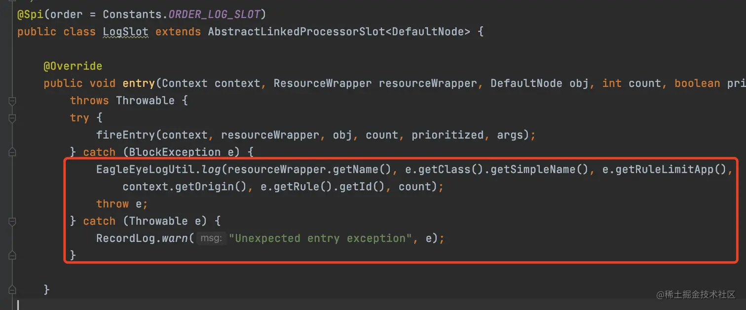 catch BlockException也很重要,当抛出BlockException这个异常,说明触发了一些设置的保护规则,比如限流了,这里面就可以进行降级操作。