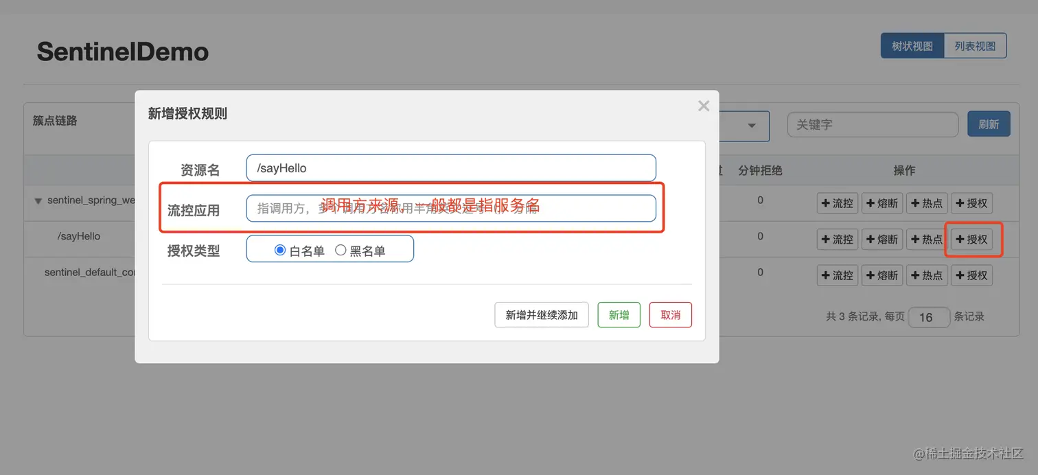 举个例子来说,比如说现在想限制来自上海的访问的人数,那么针对来源可以填上海,之后当访问的大兄弟来自上海的时候,Sentinel就会根据上海对应的OriginNode数据来判断是否达到限流的条件。